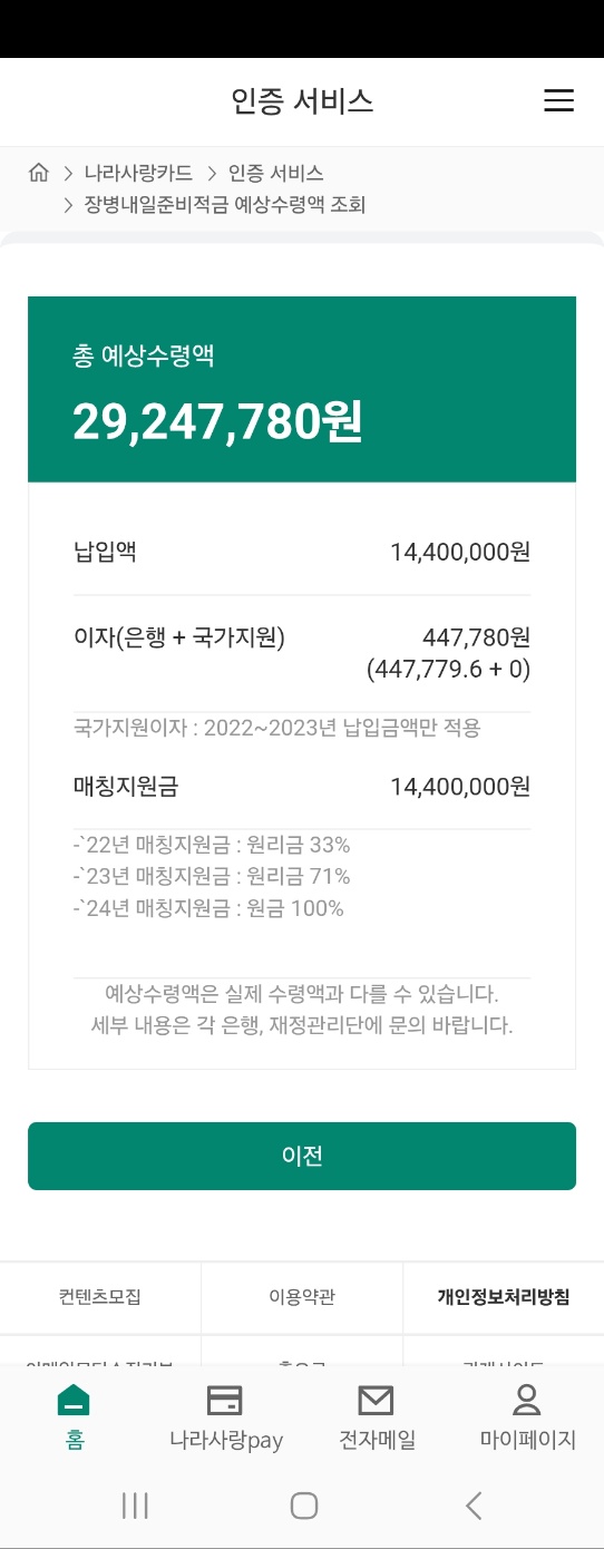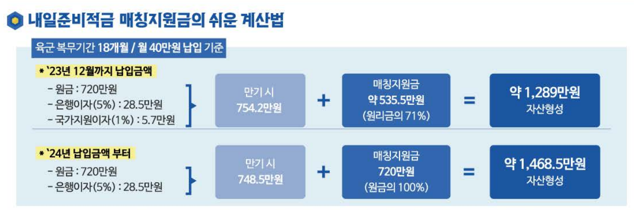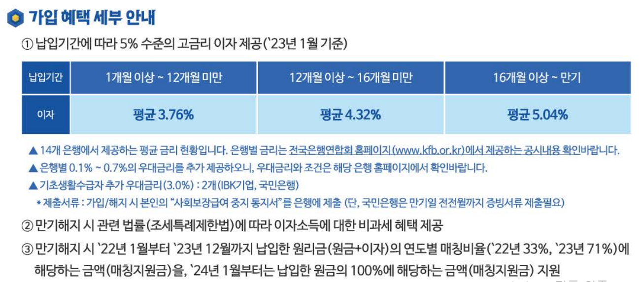 - (24년~) 적금 납입금의 은행이자(5%)에 추가하여 원금의 100%에 해당하는 매칭지원금을 지원