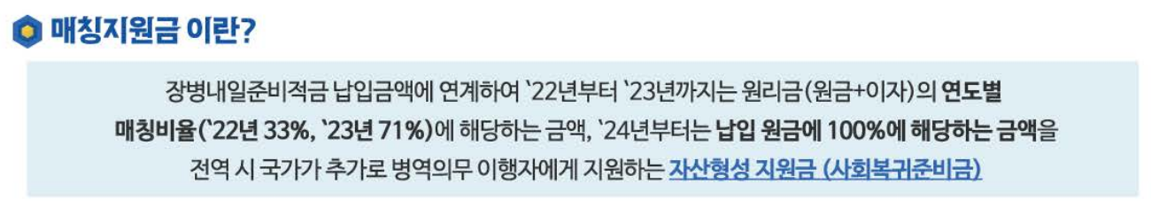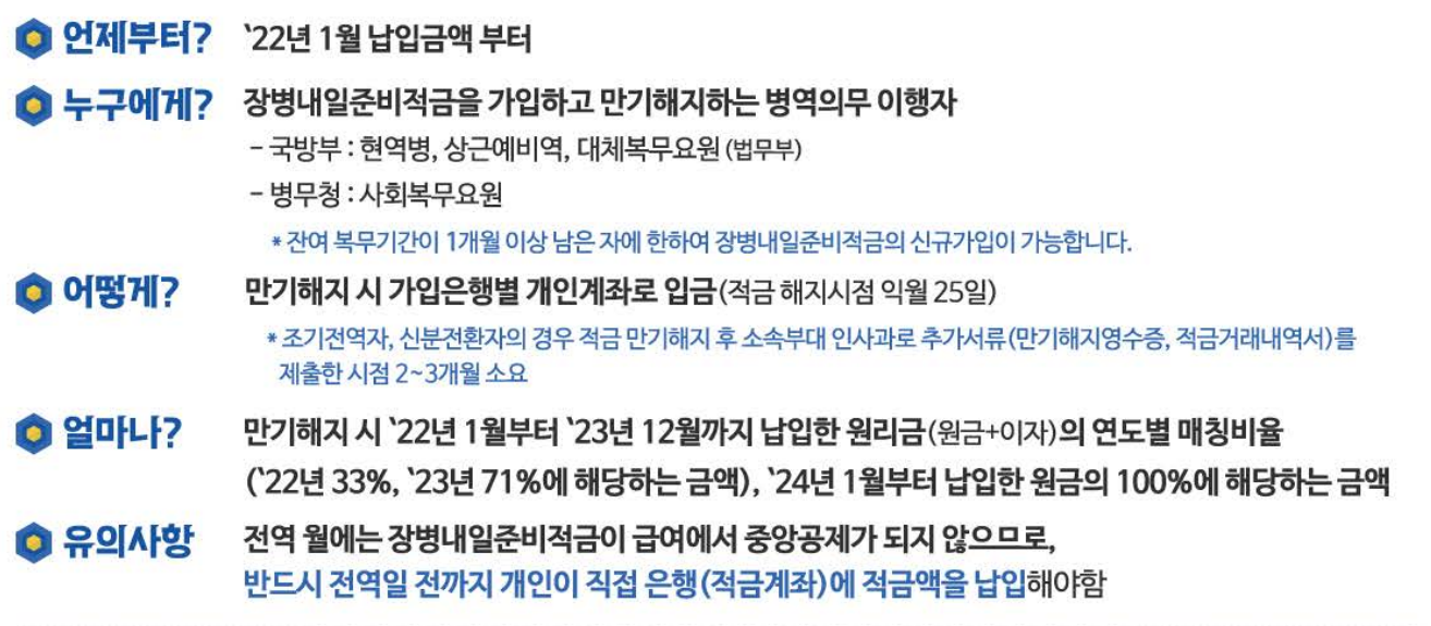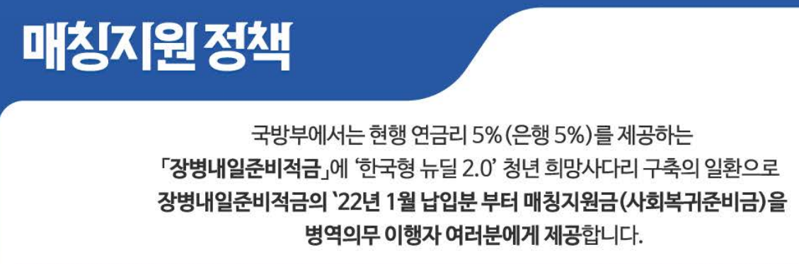 병역의무 이행기간 중 급여를 적립함으로써 합리적인 저축습관 형성을 돕고, 전역 후 목돈마련을 지원하여 사회로 진출하는 첫 발걸음을 성공적으로 내디딜 수 있는 자산형성을 지원하는 적금제도로 국방부와 금융위원회가 지원