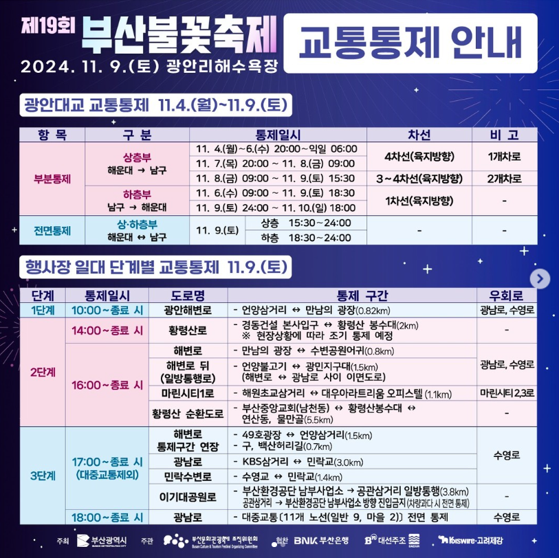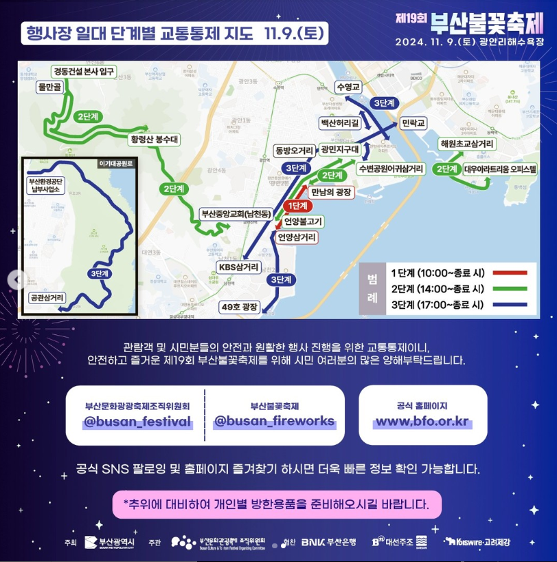 원활한 축제 진행과 안전을 위해 시간대별로 교통이 통제되니 통제 시간과 지역 확인하시어 곤란한 일 없도록 대비하시길 바랍니다