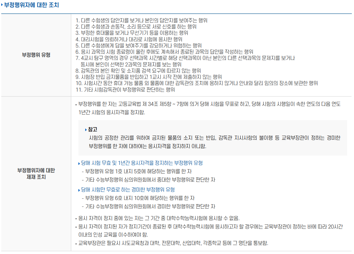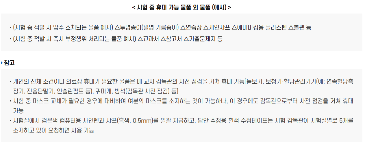 a) 시험장 반입 금지 물품 → 시험장에 가지고 올 수 없는 물품(시험 시간, 쉬는 시간 불문하고 적발 시 부정행위 처리) 휴대전화, 스마트기기(스마트워치 등), 디지털카메라, 전자사전, MP3 플레이어, 태블릿 PC, 카메라 펜, 전자계산기, 라디오, 휴대용 미디어 플레이어, 결제·통신(블루투스 등) 기능 또는 전자식 화면표시기(LCD, LED 등)가 있는 시계, 전자담배, 통신(블루투스) 기능이 있는 이어폰 등 모든 전자기기 시험장 반입 금지 물품을 불가피하게 시험장에 반입한 경우 1교시 시작 전에 감독관의 지시에 따라 제출해야 하며(미제출 시 부정행위로 간주) 응시하는 모든 영역/과목의 시험 종료 후 되돌려 받음.
