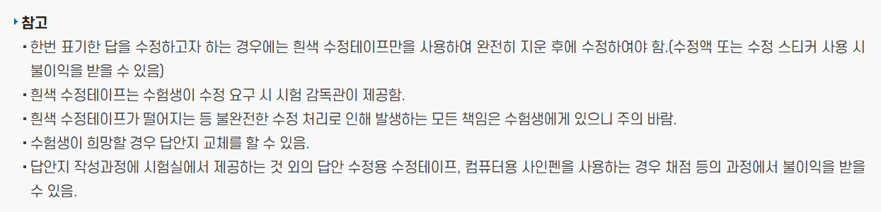 b) 시험 중 휴대 가능 물품 → 쉬는 시간 및 시험 중 소지 가능한 물품 신분증, 수험표, 검은색 컴퓨터용 사인펜, 흰색 수정테이프, 흑색 연필, 지우개, 샤프심(흑색, 0.5mm), 결제·통신(블루투스 등) 기능 및 전자식 화면표시기(LCD, LED 등)가 모두 없는 시침·분침(초침)이 있는 아날로그시계, 마스크(감독관 사전 확인) 등