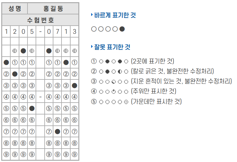 *이미지 스캐너를 이용하여 채점하므로, 검은색 컴퓨터용 사인펜 이외 연필, 샤프 등을 사용하거나, 특히, 펜의 종류와 상관없이 예비마킹을 할 경우 중복 답안 등으로 채점되어 불이익을 받을 수 있습니다.