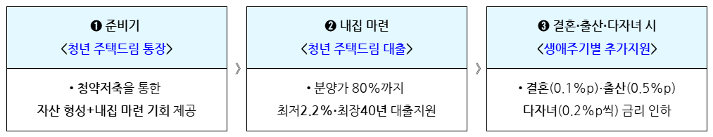 파격적인 청년 전용 청약통장을 신설하고, 역대 최초로 청약통장과 대출을 연계하여 장기․저리의 대출을 지원할 뿐만 아니라, 결혼․출산․다자녀 등 全생애주기에 걸쳐 추가 혜택을 부여하는 주거지원 방안입니다.