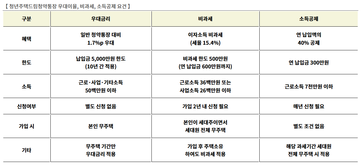 1) 청년주택드림청약통장은 주택청약종합저축의 일종으로 재형기능을 강화하기 위해 우대금리와 이자소득 비과세 혜택을 제공하는 상품으로 주택청약종합저축의 하위 상품 이라 할 수 있습니다